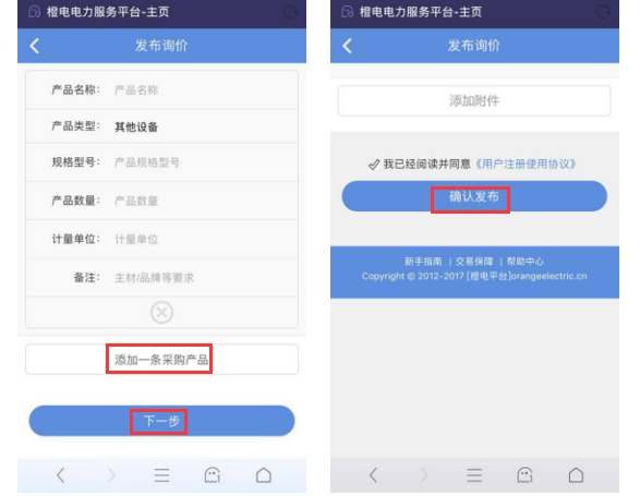 23. 點(diǎn)擊“確認(rèn)發(fā)布”,即成功發(fā)送到橙電后臺審核,橙電客服將會及時審核你所發(fā)布的詢價單。