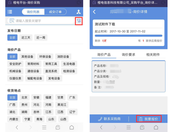 2. 查看詢價詳情:可通過“輸入搜索關(guān)鍵字”或按“發(fā)布日期”、“詢價產(chǎn)品”、“收貨地點(diǎn)”來篩選要報價的產(chǎn)品,點(diǎn)擊該詢價產(chǎn)品進(jìn)入詢價詳情頁;