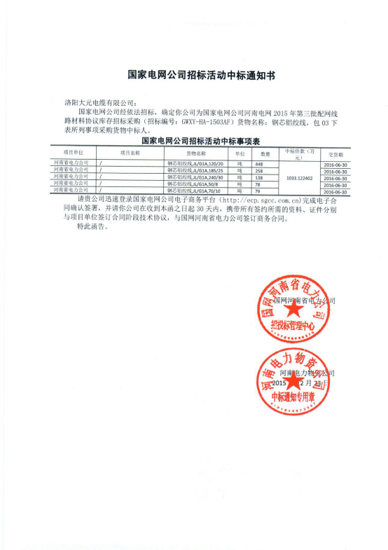 大元電纜 國家電網(wǎng)公司合格供應(yīng)商,河南省科技型企業(yè),洛陽市節(jié)能鋁合金導(dǎo)線企業(yè)研發(fā)中心,注冊資金2億元,有20余條電線電纜生產(chǎn)線,主要生產(chǎn)電力電纜、光伏電纜、鋼芯鋁絞線、合金鋁絞線、架空絕緣電纜、軍工導(dǎo)線等。目前公司綜合實(shí)力位于華中地區(qū)同行業(yè)前五。 公司設(shè)備先進(jìn)、種類齊全,且擁有一批高素質(zhì)、年輕化、專業(yè)化的管理、技術(shù)人才。管理體系完備,生產(chǎn)工藝先進(jìn),檢驗(yàn)程序完善,產(chǎn)品質(zhì)量可靠?,F(xiàn)已通過國家產(chǎn)品安全認(rèn)證、ISO9001質(zhì)量體系認(rèn)證、CCC中國國家強(qiáng)制性產(chǎn)品認(rèn)證、職業(yè)健康安全管理體系認(rèn)證、環(huán)境管理體系認(rèn)證、工業(yè)產(chǎn)品生產(chǎn)許可證、國際標(biāo)準(zhǔn)產(chǎn)品標(biāo)志證書、德國TUV認(rèn)證等。 品牌公司國內(nèi)主要客戶或合作企業(yè)有中國國電、國家電網(wǎng)、南瑞集團(tuán)、通達(dá)電纜、平煤集團(tuán)、重慶四聯(lián)、樂山電纜、江陽電纜、中錄科技等。外貿(mào)業(yè)務(wù)已拓展到美國、菲律賓、孟加拉、羅馬尼亞、澳大利亞和智利等20余個(gè)國家和地區(qū)。點(diǎn)擊查看